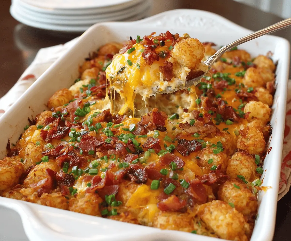 This tasty bacon, egg, and tater tot casserole is perfect for breakfast or brunch. It layers crispy tater tots, savory bacon, and fluffy eggs for a hearty dish everyone will love!