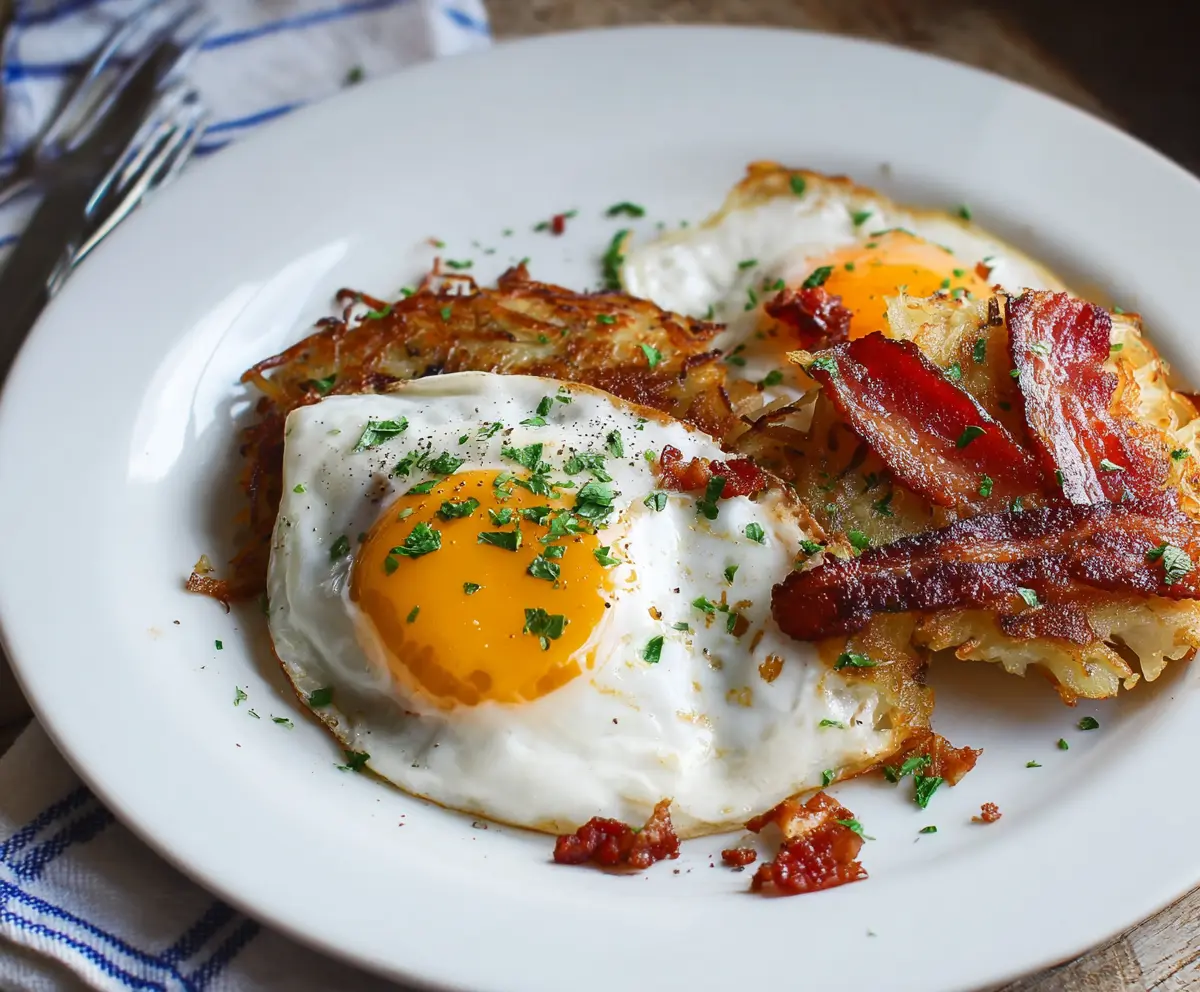 To serve, arrange the crispy hash browns on a plate, lay the bacon alongside, and place the fried eggs on top or beside them. Garnish with freshly chopped chives or parsley for a burst of color and flavor. Dig in and enjoy your hearty Bacon Hash Browns and Eggs!