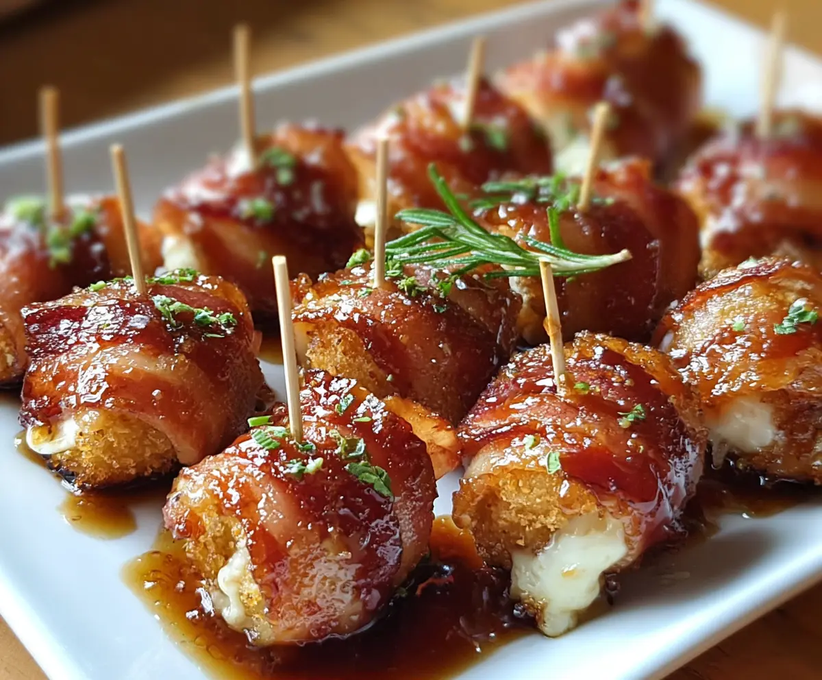 Arrange your crispy bacon mozzarella poppers on a serving plate. Drizzle or brush the warm maple glaze over them generously. Sprinkle with coarse sea salt and garnish with chopped parsley or chives for a pop of color!