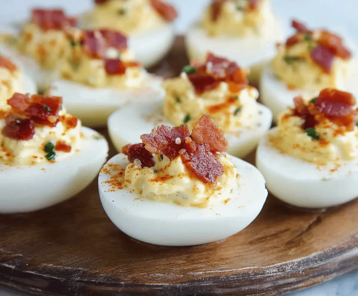 Absolutely! You can use turkey bacon for a lower-fat option or pancetta for a different flavor profile. Just ensure whatever bacon you choose is cooked until crispy for the best texture in the deviled eggs.