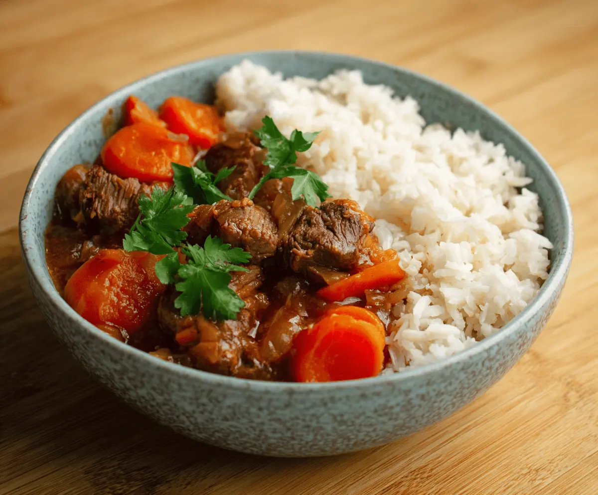 This classic beef stew with rice features tender beef, hearty carrots, and savory broth paired with fluffy white rice—a filling and flavorful meal perfect for any day.