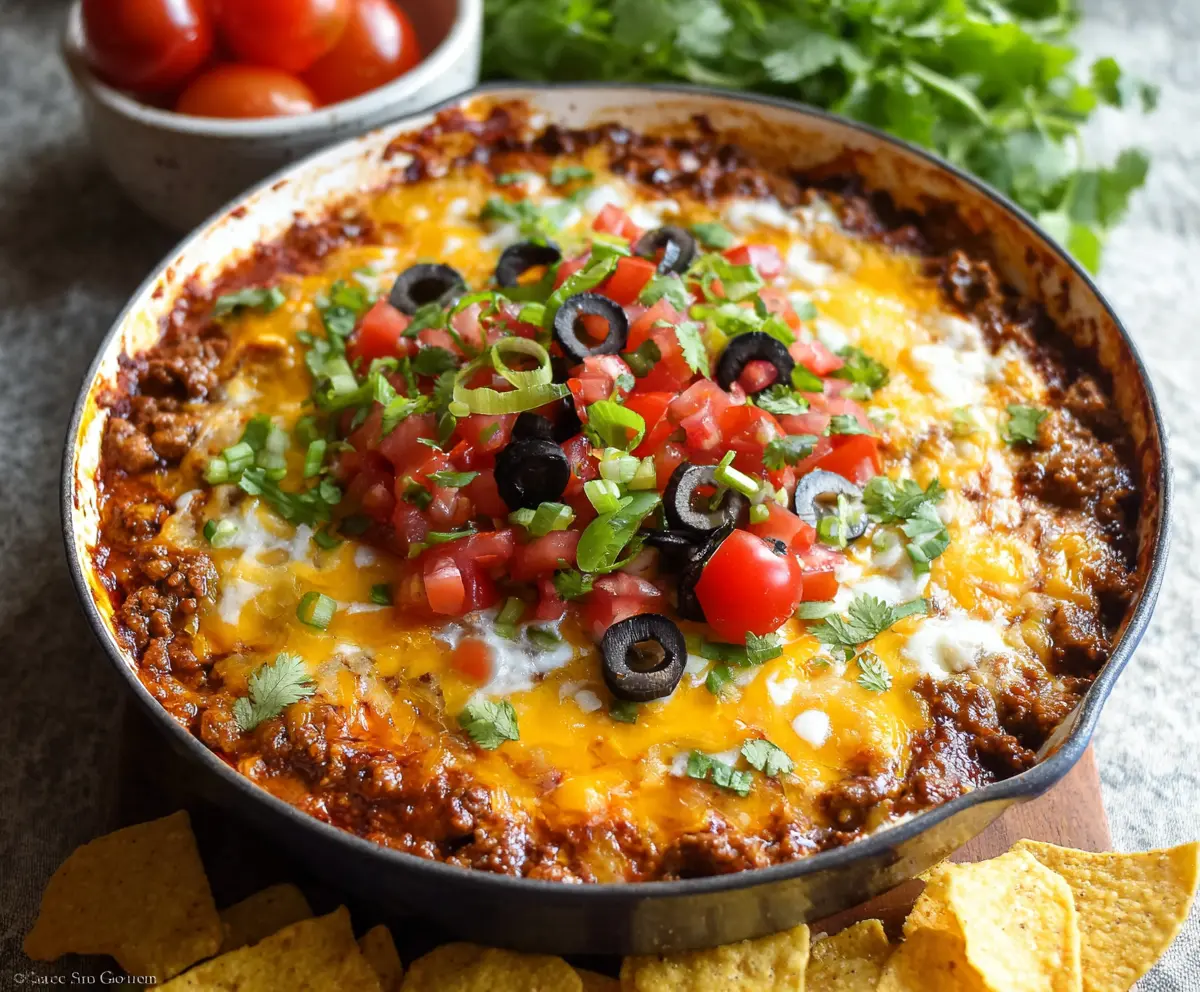 Your Beefy Taco Dip is now ready to be devoured! Serve it hot with crunchy tortilla chips for dipping. Enjoy every bite!