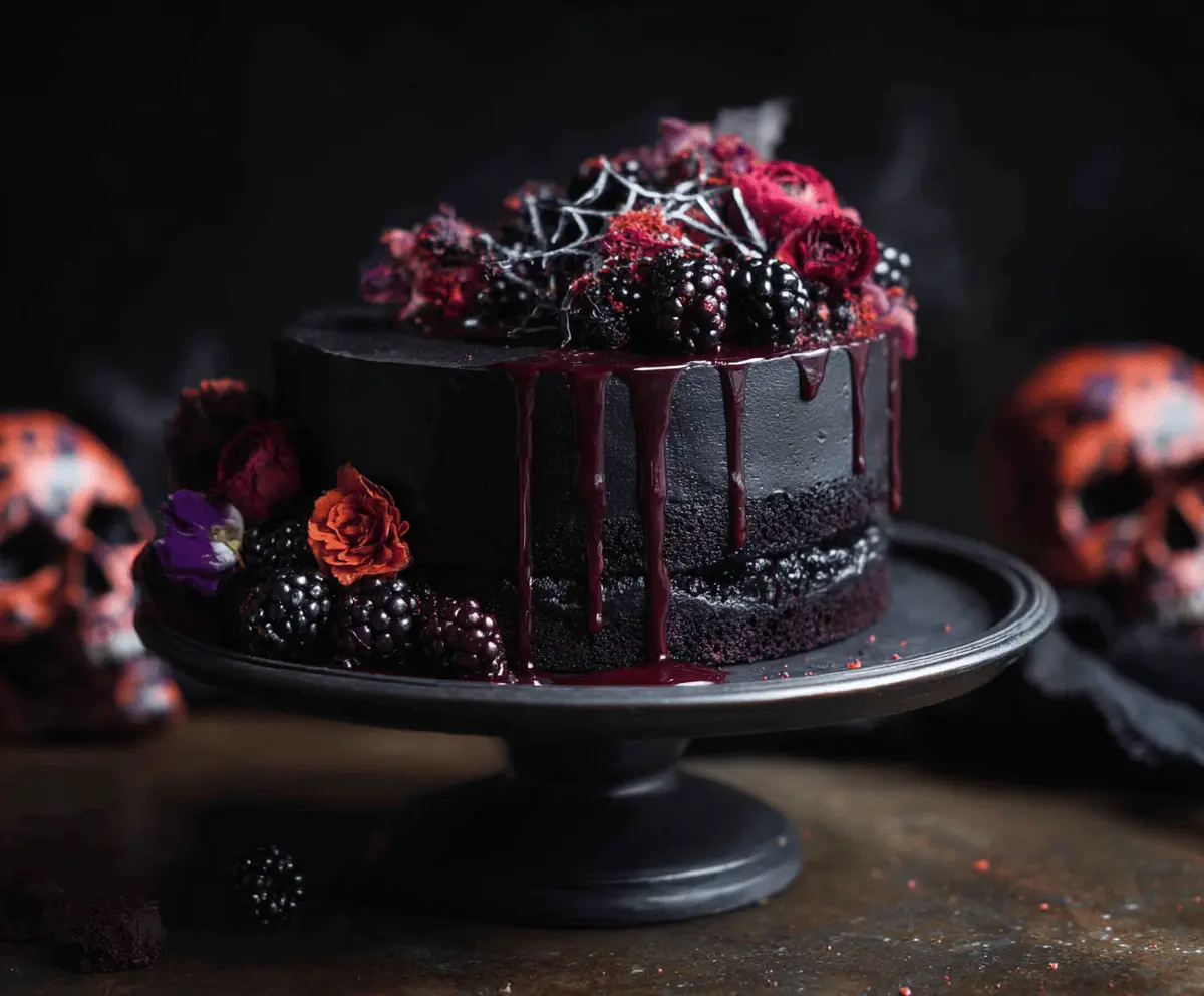 This elegant and haunting Black Velvet Halloween Cake features rich dark chocolate layers tinted deep black and enveloped in luscious black buttercream with splendid ganache drips. The delightful fresh berries and terrifying decorations make it the perfect centerpiece for your Halloween celebration. Enjoy every spooky bite! 🎃