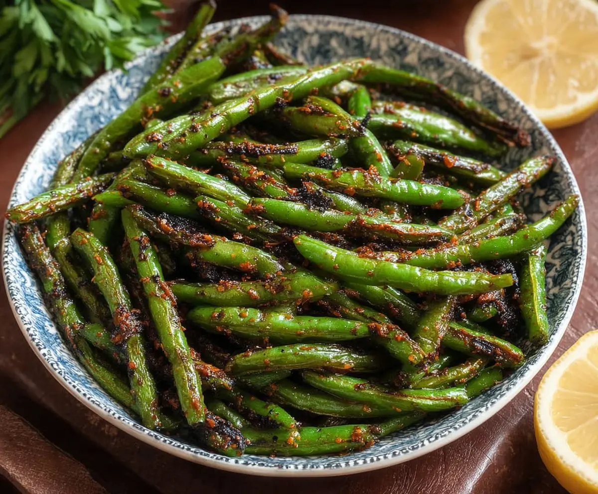 Once the green beans are tender-crisp and have a lovely blackened exterior, remove them from the skillet and place them in a serving dish. If you like, drizzle some fresh lemon juice on top and garnish with chopped parsley for extra color and flavor. Serve them hot as a delicious side dish!