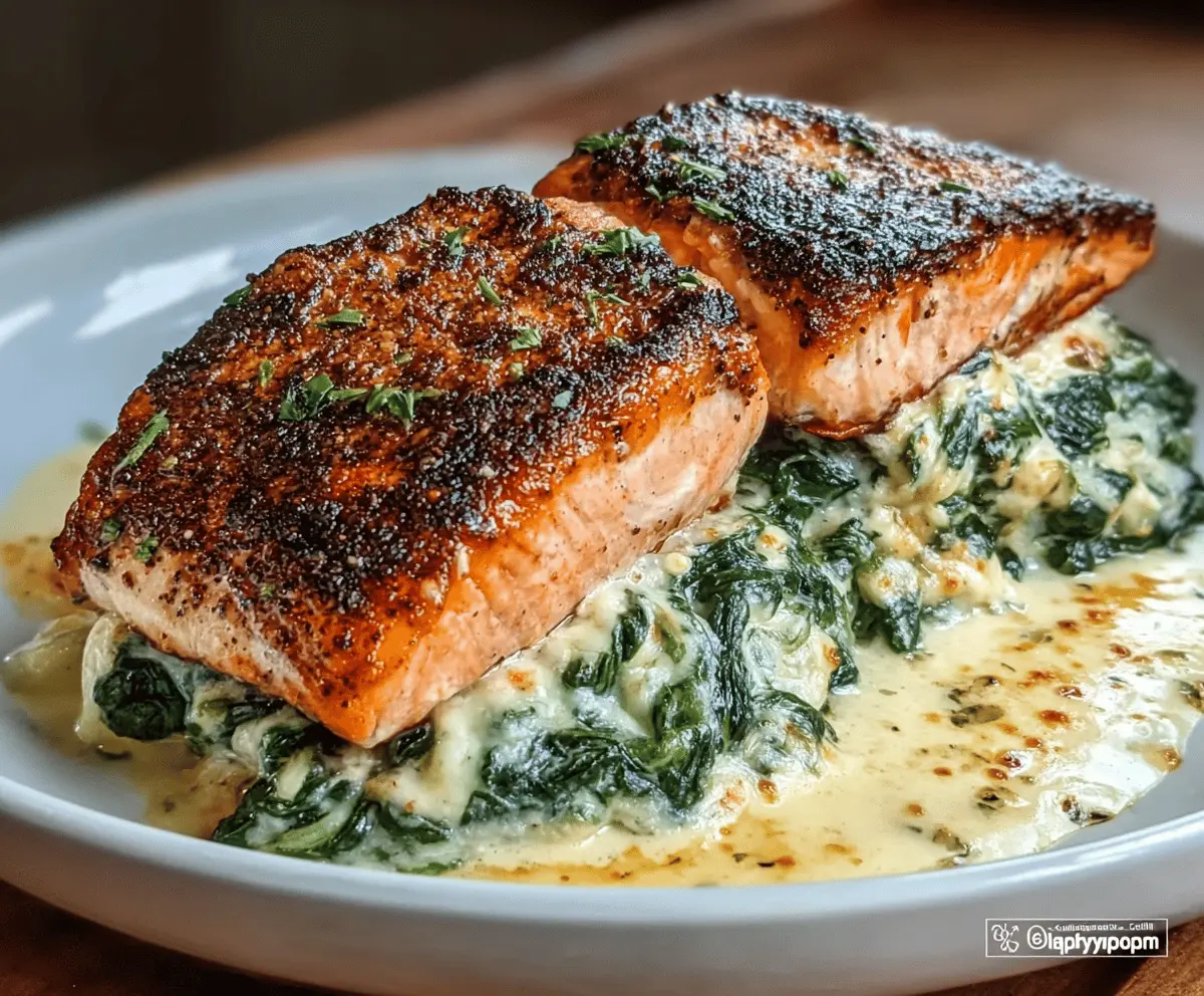 Enjoy your delicious blackened salmon stuffed with creamy spinach and Parmesan filling—it’s sure to impress!