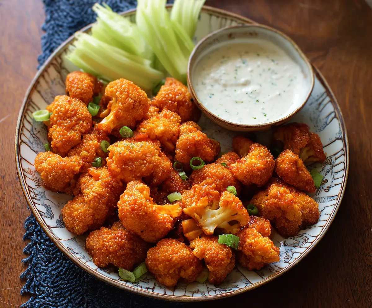 Once out of the oven, garnish your Buffalo Cauliflower Bites with chopped chives or parsley. Serve them hot with celery sticks and your favorite ranch or blue cheese dressing for dipping. Enjoy every crispy, spicy bite!