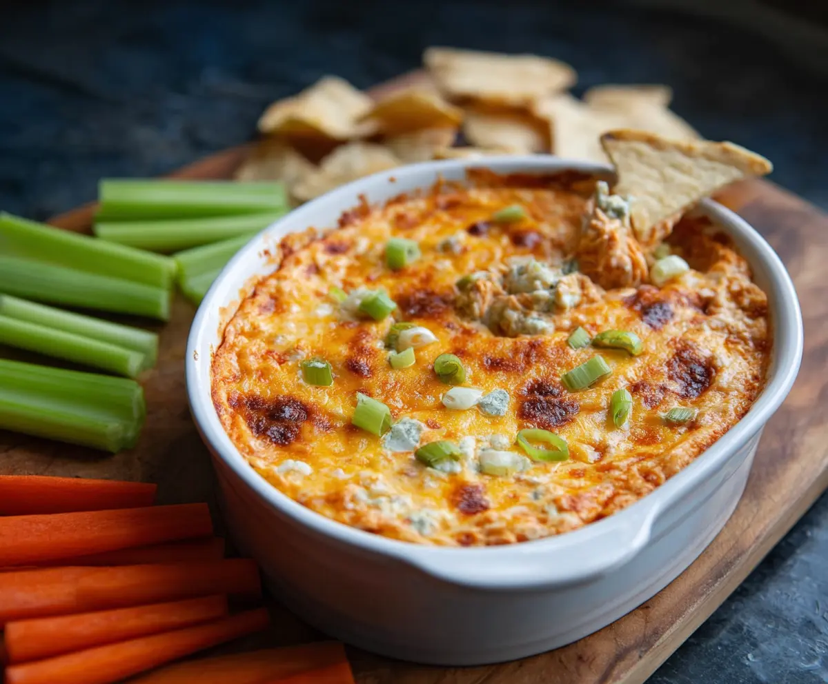 Once it’s done, carefully remove the dip from the oven. If you like, sprinkle chopped green onions over the top for a little color and crunch. Serve it warm with crispy celery sticks and tortilla chips for dipping.