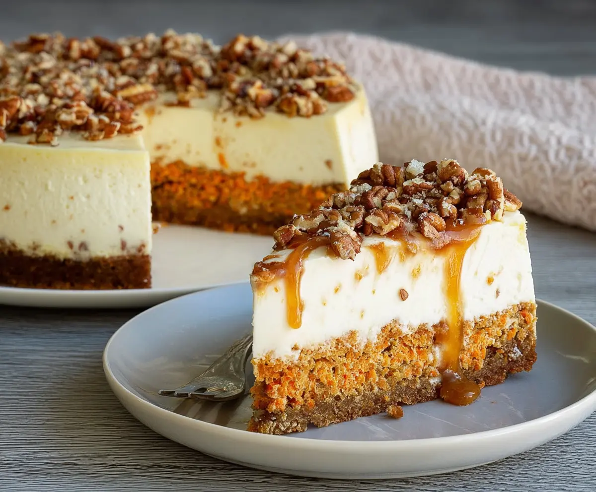 When you’re ready to enjoy your cheesecake, take it out of the springform pan. Arrange the caramelized nuts around the edge of the cheesecake. Drizzle caramel sauce in the center and let it gently flow down the sides. If you like, add some fresh thyme sprigs on top for a beautiful garnish. Now, slice, serve, and enjoy your rich and creamy Carrot Cake Cheesecake with its delightful crunch and caramel sweetness!