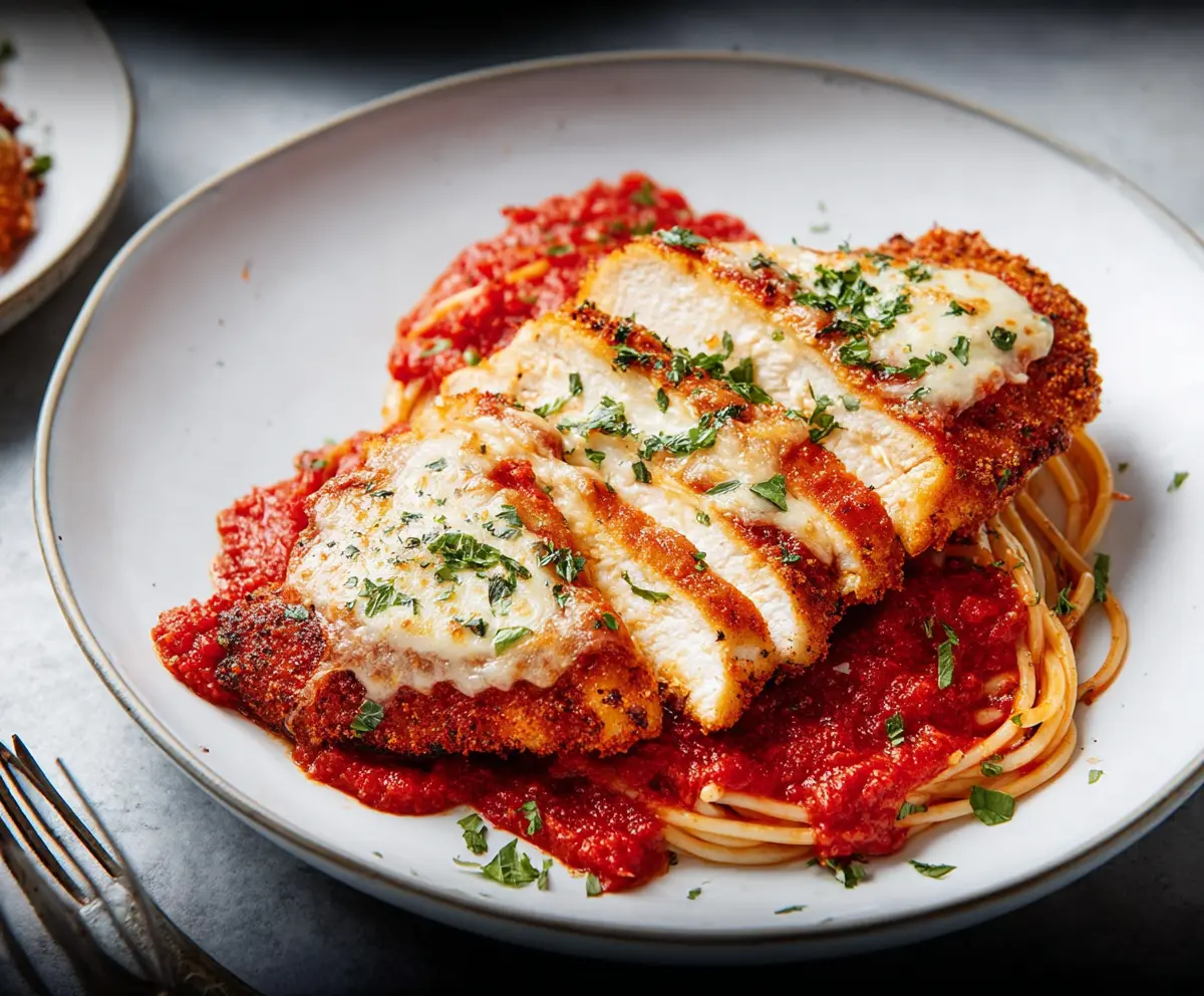 Once baked, take the Chicken Parmesan out of the oven. Garnish with freshly chopped basil or parsley for that lovely touch! Serve hot with a side of pasta, garlic bread, or a fresh green salad.
