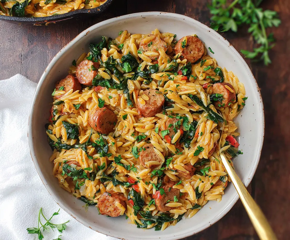 Once the orzo is ready, add the fresh spinach and the cooked chicken sausage back to the skillet. Cook for another 2-3 minutes until the spinach wilts and everything is heated through. It’ll turn a lovely vibrant green!
