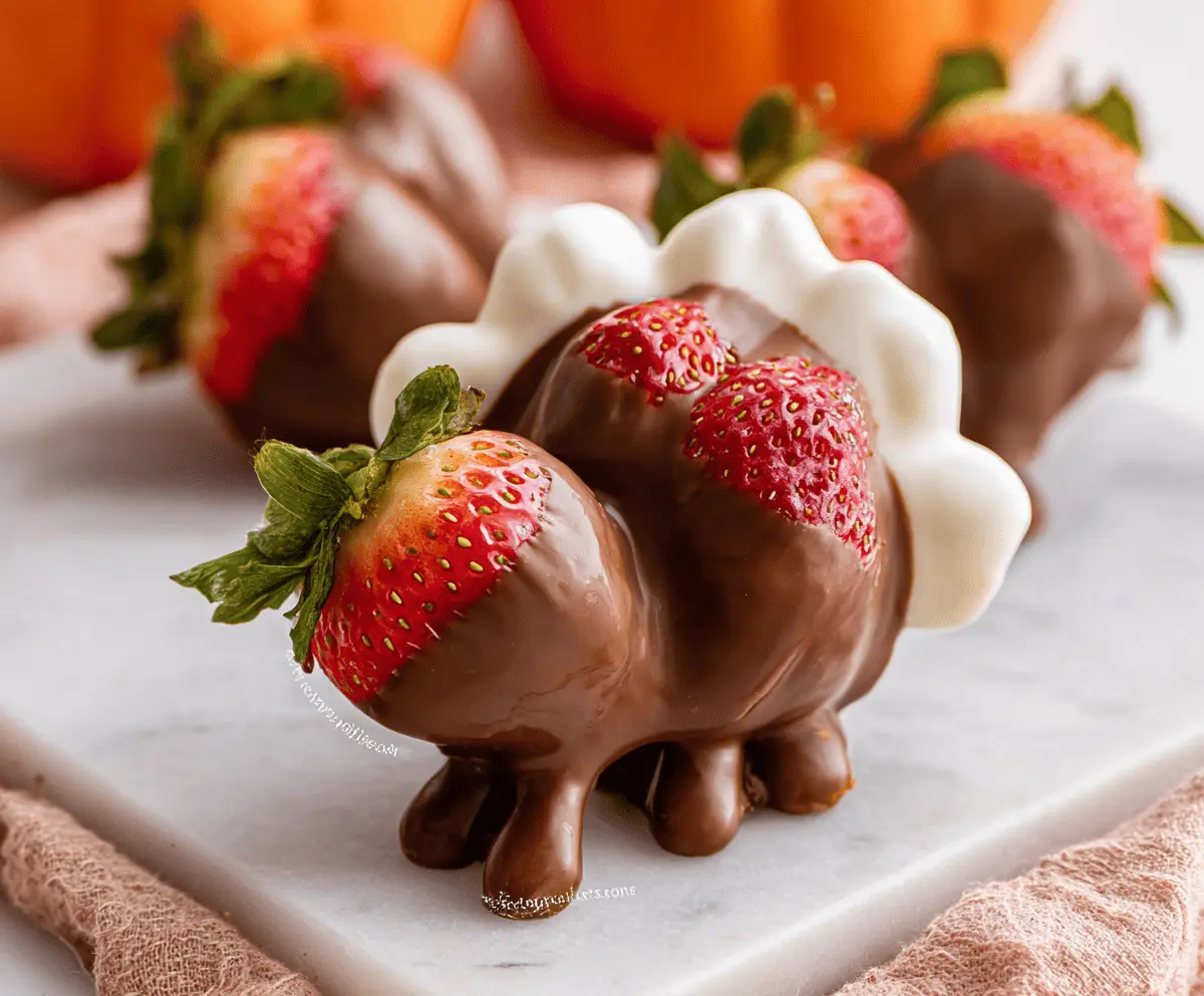 Once the chocolate is set, arrange the Chocolate Covered Strawberry Turkeys on a platter. Enjoy them as delightful Thanksgiving treats that everyone will love!