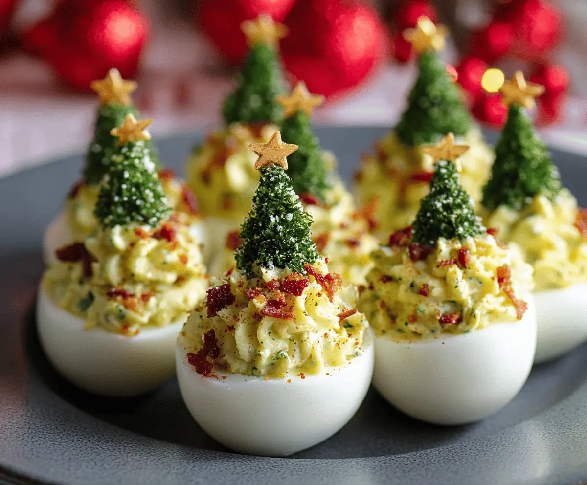 Now it’s time to make them festive! Lightly sprinkle a little paprika over the top of each filled egg for color. Then, place a small broccoli floret or a sprig of parsley or rosemary in the center of each yolk mound. They’ll look just like mini Christmas trees!