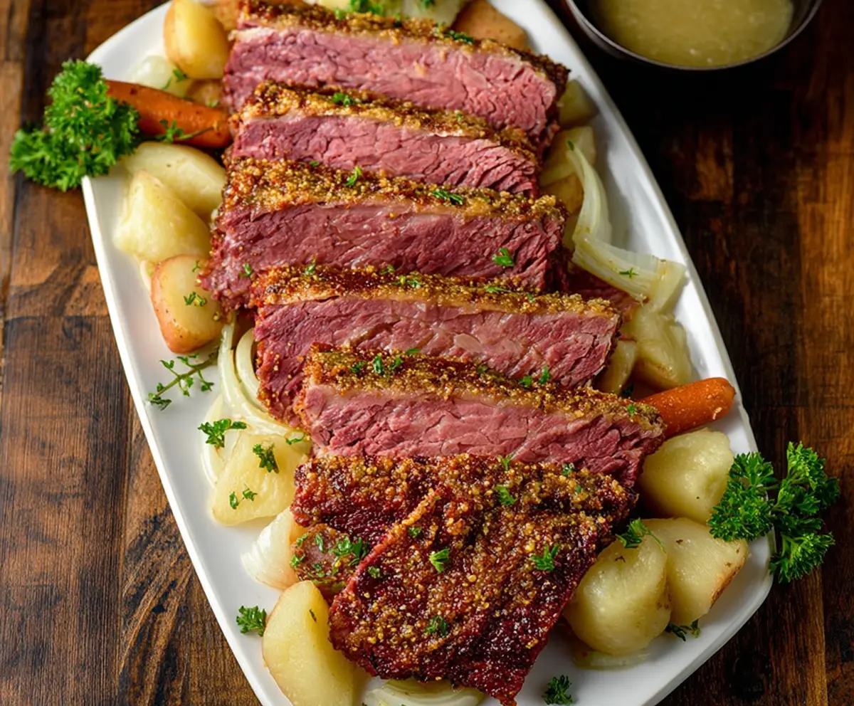 After broiling, let the corned beef rest for a few minutes before slicing it thinly across the grain. Serve it up with the tender vegetables, fluffy mashed potatoes, and any extra mustard glaze or au jus from the cooking liquid.