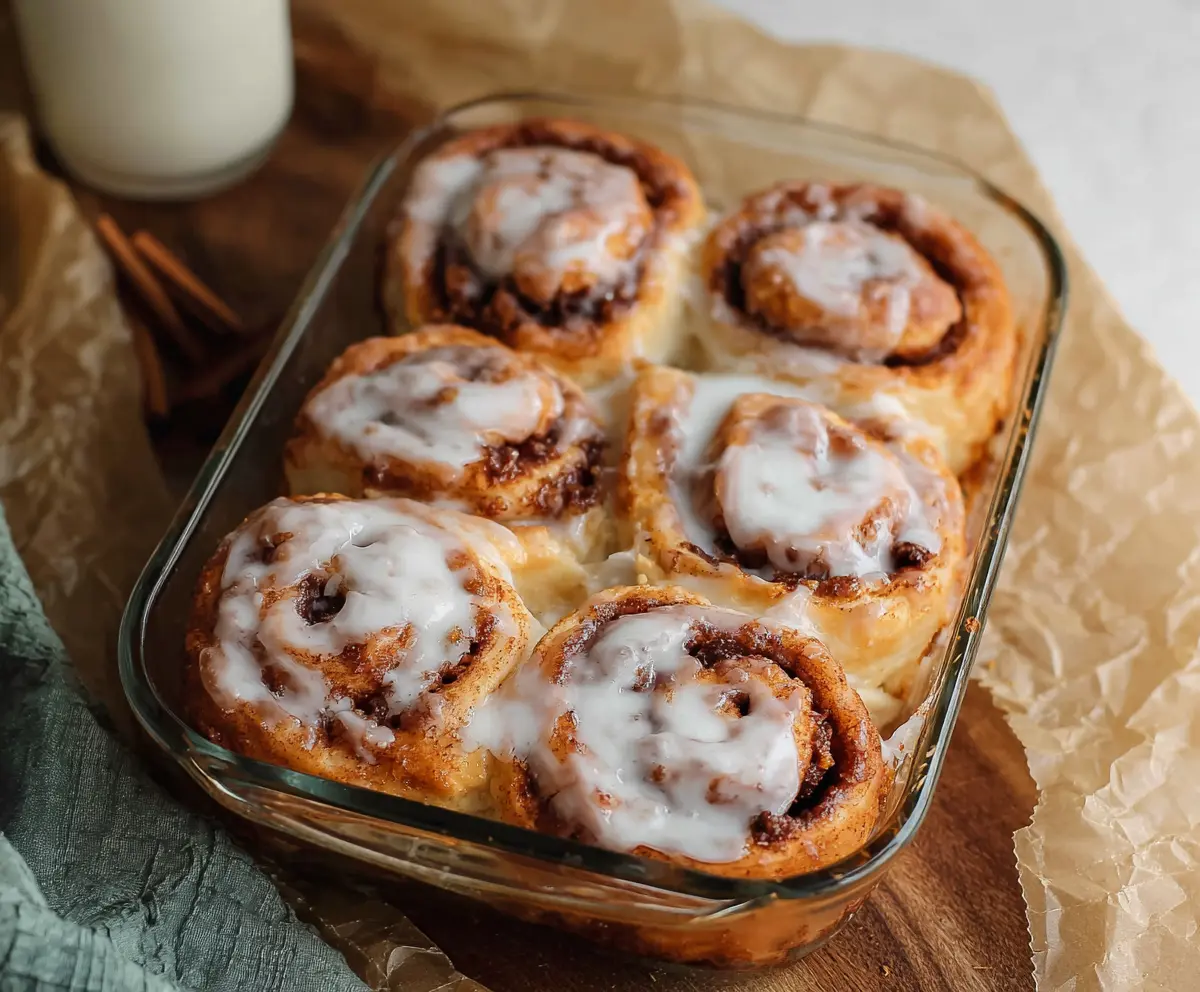 This recipe takes about 2-2.5 hours in total. You’ll spend about 30 minutes preparing and assembling the rolls, with two rising periods totaling about 2 hours. Once they’re in the oven, they will bake for about 25-30 minutes. You’ll also need a little time for mixing the icing and letting the rolls cool before serving!