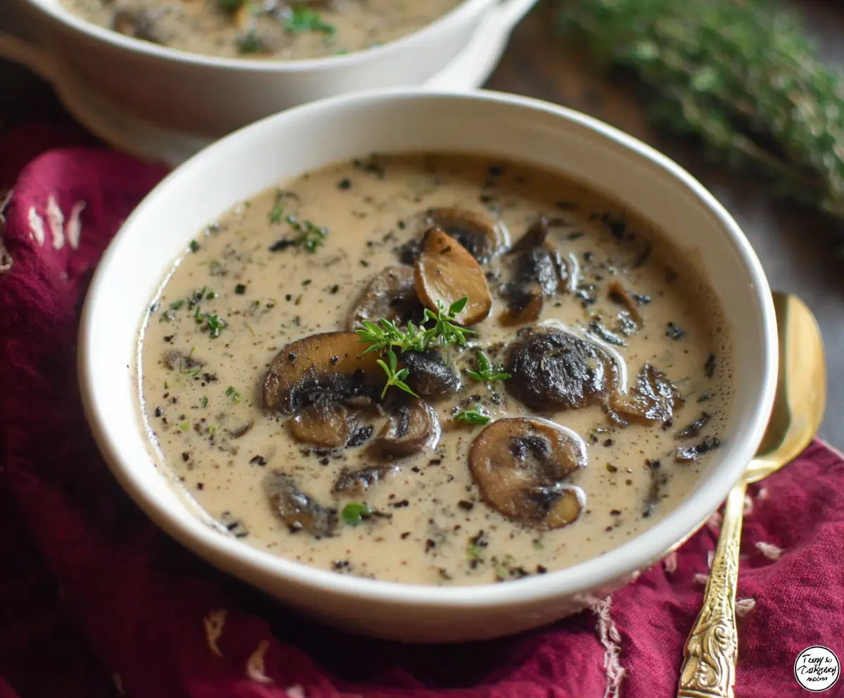 After the mushrooms are ready, pour in the vegetable or chicken broth. Add in the thyme (dried or fresh) and bring the soup to a boil. Once boiling, reduce the heat and let it simmer for about 10 minutes so all those wonderful flavors can blend together.