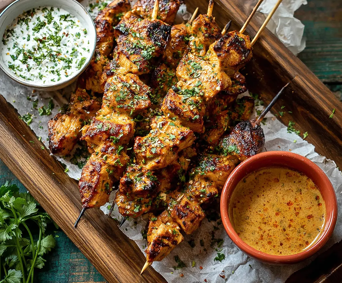 Once cooked, remove the skewers from the grill and arrange them on a serving platter. Garnish with additional chopped parsley and crumbled feta cheese if you like. Serve your Cowboy Butter Chicken Skewers immediately with your favorite dipping sauce or alongside some fresh veggies or warm bread.