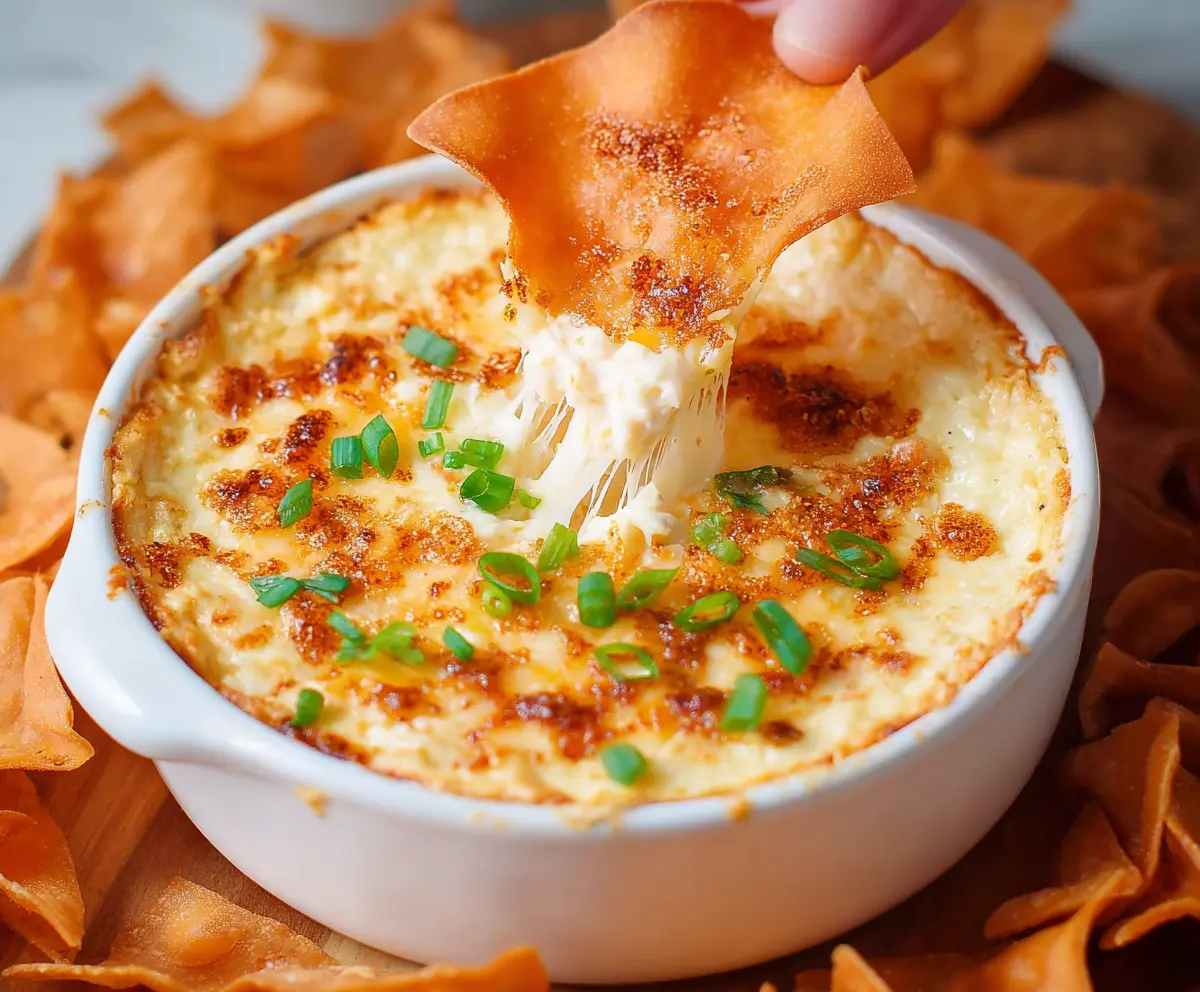 Once the dip is ready, sprinkle some extra sliced green onions on top for a beautiful finish. Serve it hot alongside your crispy wonton chips. If you like, you can add some sweet chili sauce for dipping. Enjoy this delicious, creamy, and crunchy appetizer with friends and family!