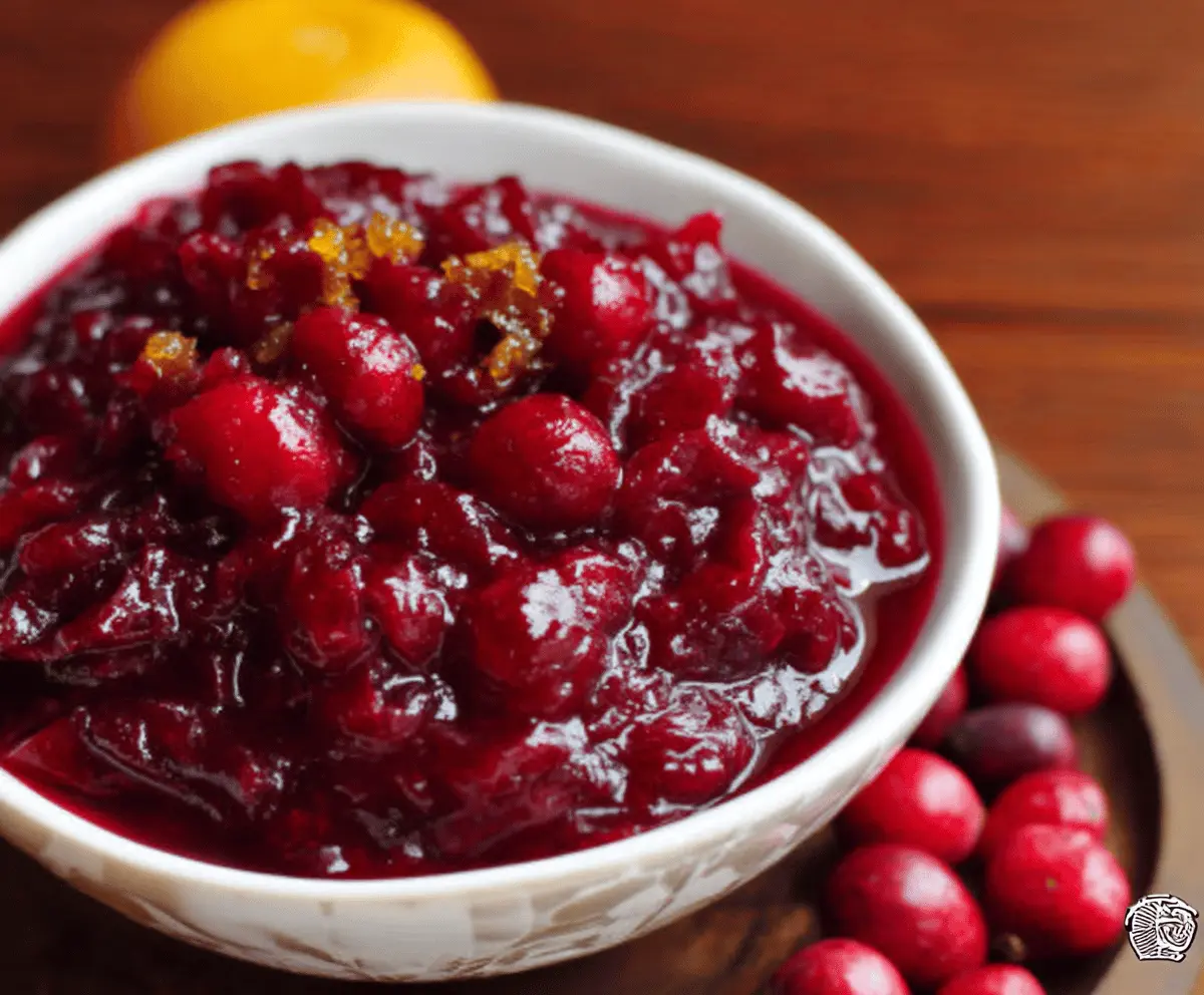 Delicious homemade cranberry sauce with orange marmalade served in a glass bowl.