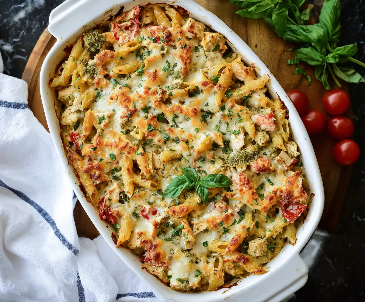 This creamy basil pesto chicken pasta bake is a warm and comforting dish that combines tender chicken with tasty pasta and rich pesto. It’s like a hug on a plate!