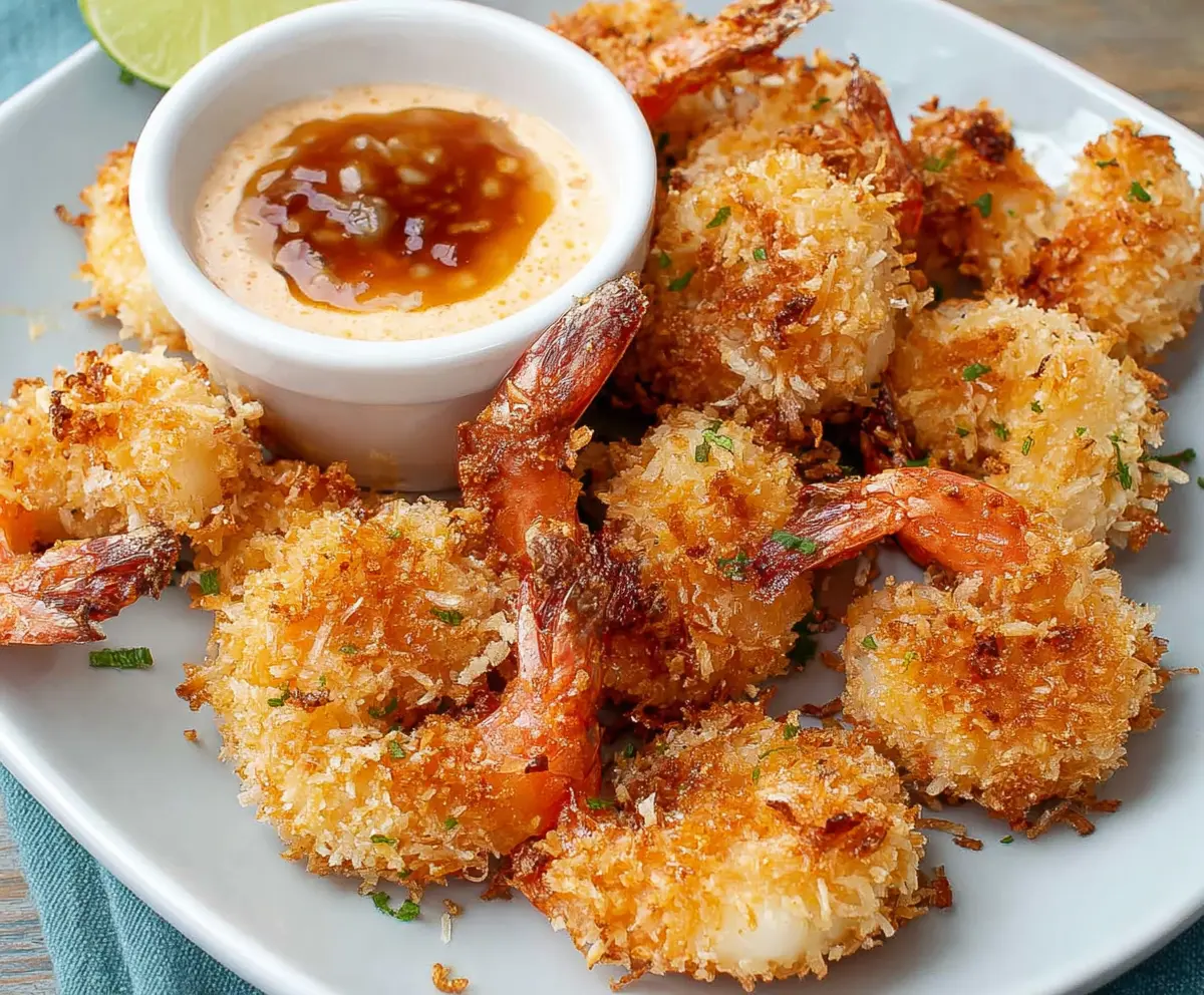 Enjoy your delightful crispy, golden-baked coconut shrimp with a tangy and sweet dip! They’re sure to be a hit!