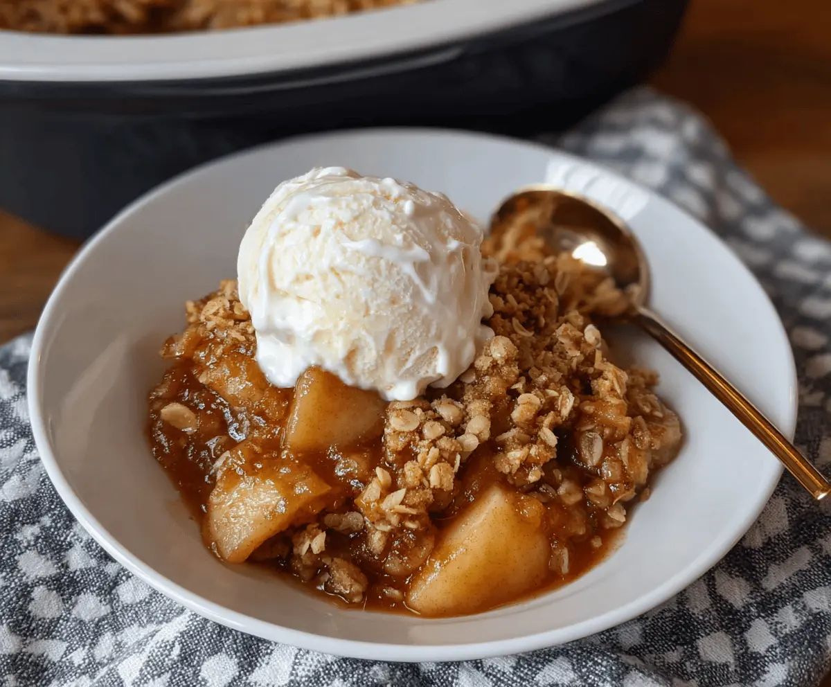Once it’s done cooking, spoon the warm apple crisp into bowls. It’s best served warm, with a scoop of vanilla ice cream or a dollop of whipped cream on top for that perfect finishing touch. Enjoy every delicious bite!