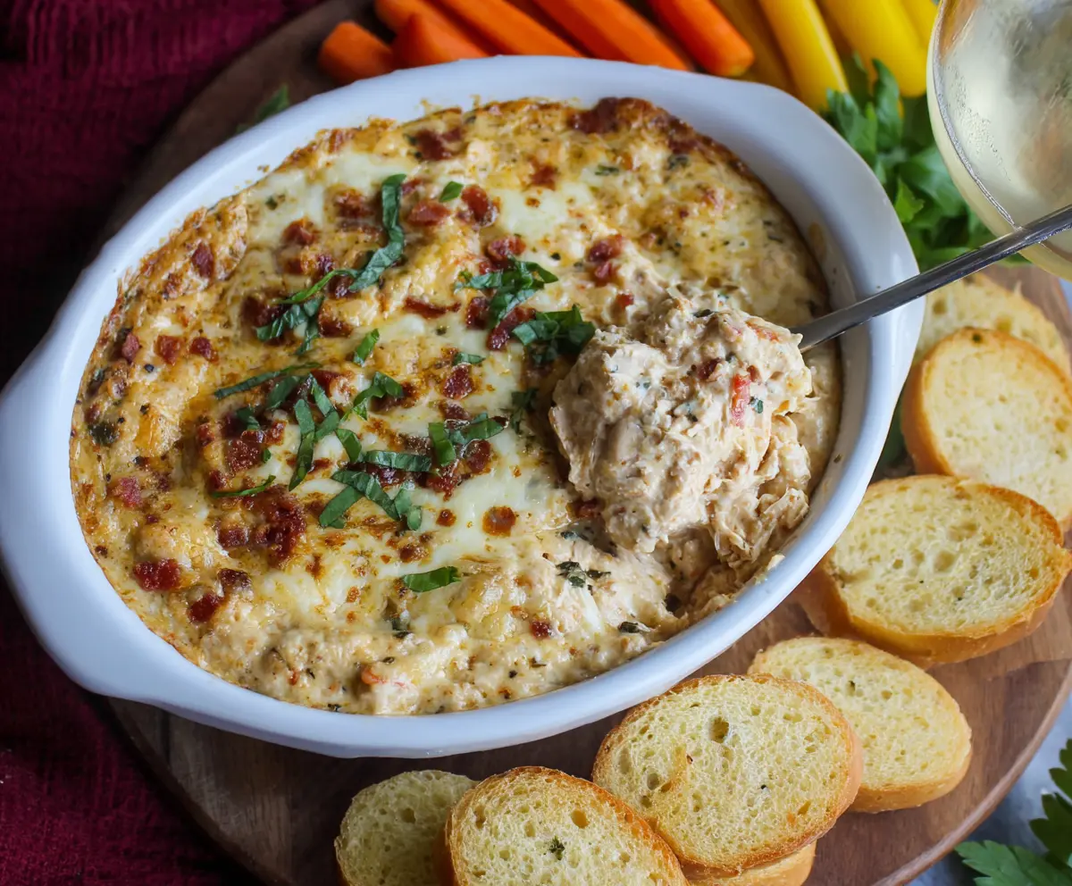 This creamy, cheesy chicken dip is a crowd-pleaser with its flavorful kick from the red pepper flakes and aromatic herbs. Enjoy every bite!