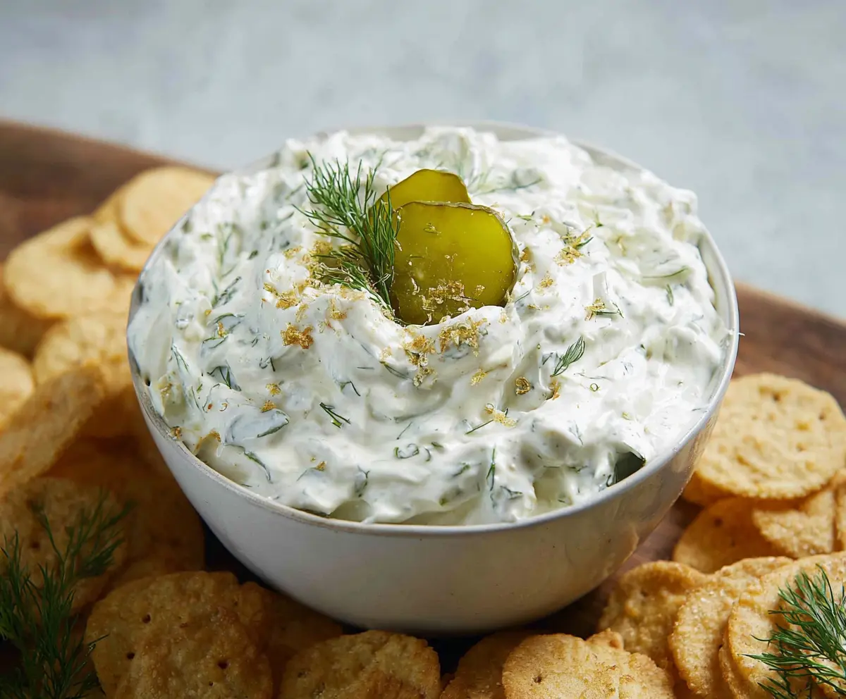 Enjoy this tangy, creamy Dill Pickle Dip as a crowd-pleasing appetizer or snack!