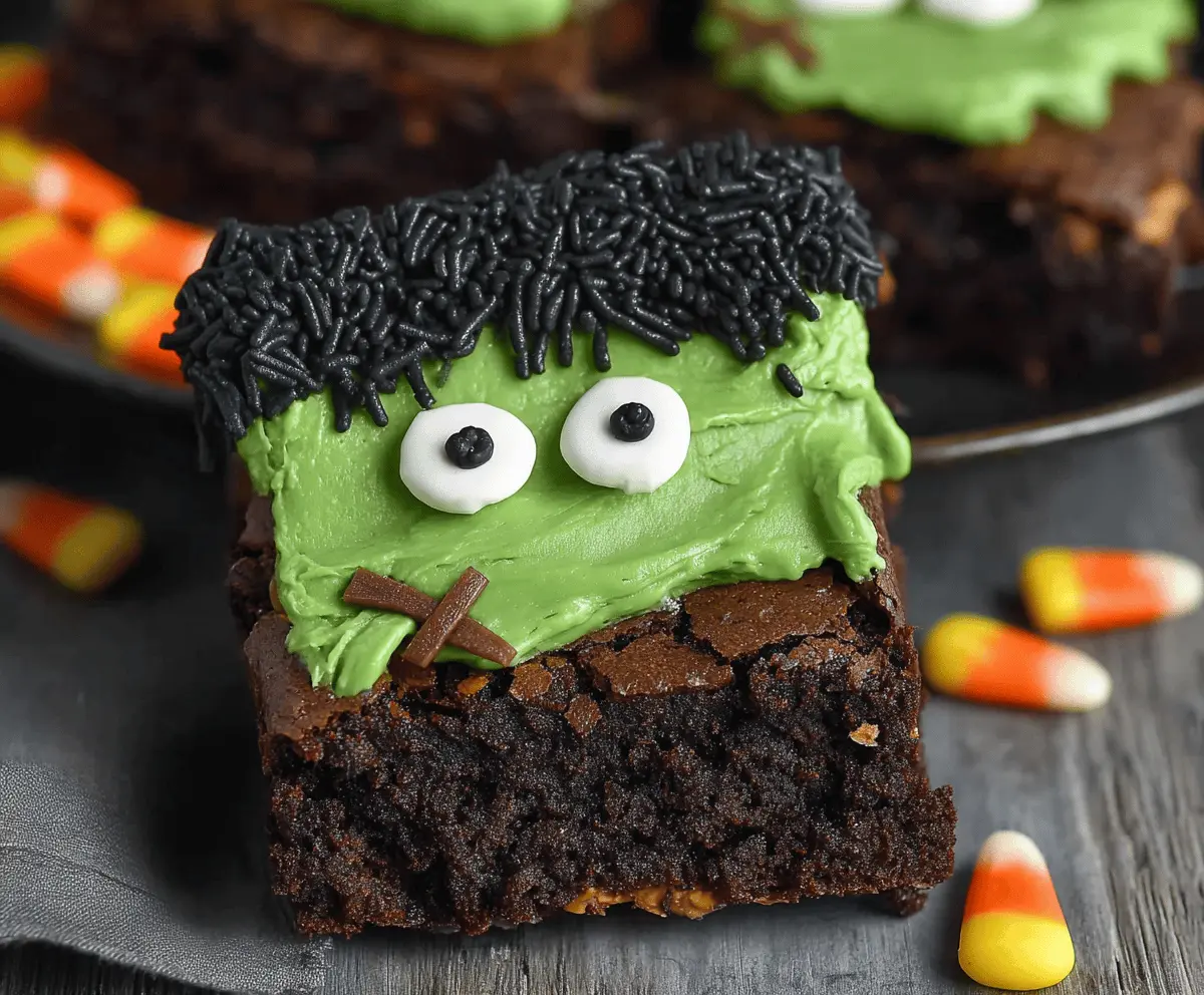 Using a sharp knife, cut the brownies into squares, making sure each piece showcases the fun face design. For a final touch, you can place candy corn pieces around the brownies for some extra festive flair. Now serve and enjoy these spooky Frankenstein brownies with friends and family!