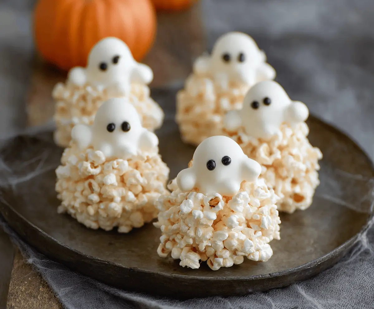 Allow the assembled ghost popcorn balls to set fully before serving, making sure the ghosts are secure. Now they’re ready to delight your Halloween guests!