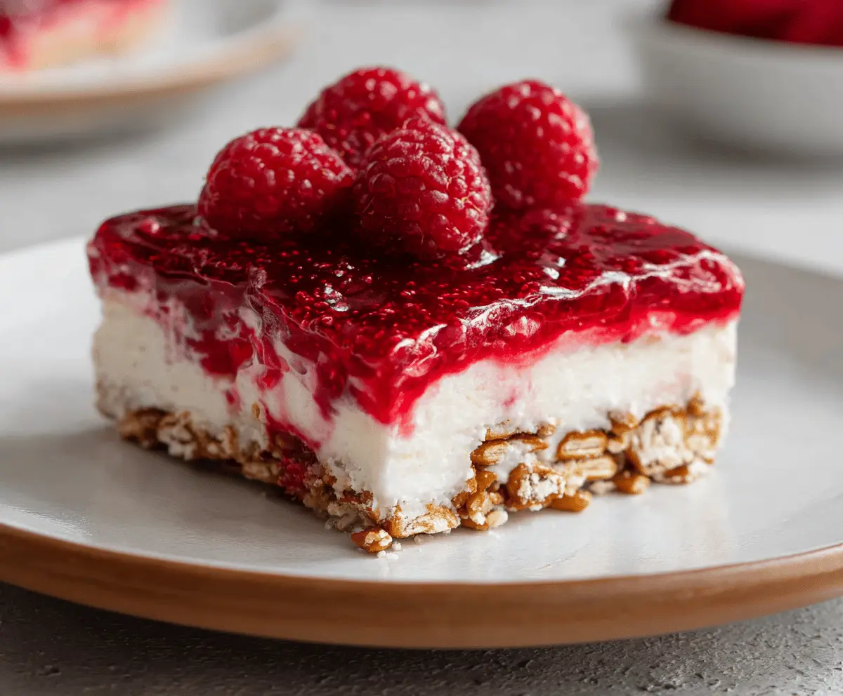 Now it’s time to put everything together! Pour a layer of fresh raspberries over the cream cheese layer you just spread on top of the cooled pretzel crust. Carefully pour the cooled raspberry gelatin over the raspberries, making sure to spread it evenly. This colorful layer adds a refreshing touch!