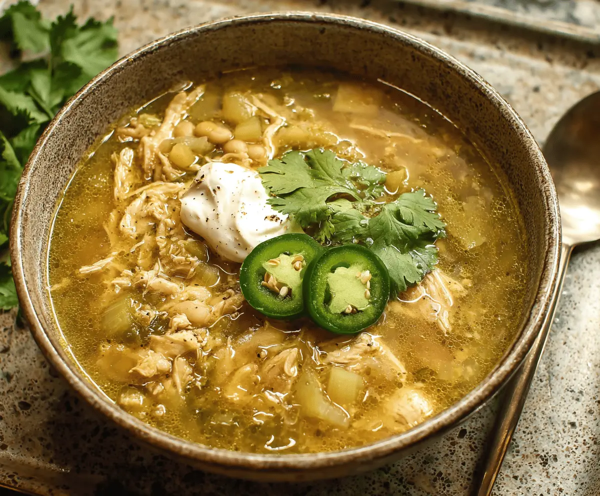 A steaming bowl of green chile chicken soup topped with fresh herbs and melted cheese, featuring tender chicken, vibrant green chiles, and creamy broth in a rustic bowl.