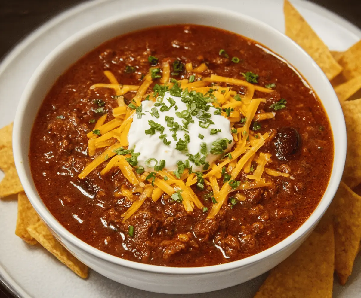 Dish out the chili into bowls and top each serving with shredded cheddar cheese, a dollop of sour cream, and a sprinkle of chopped green onions or cilantro. For an added crunch, serve with tortilla chips on the side. Enjoy your warm, hearty homemade chili!