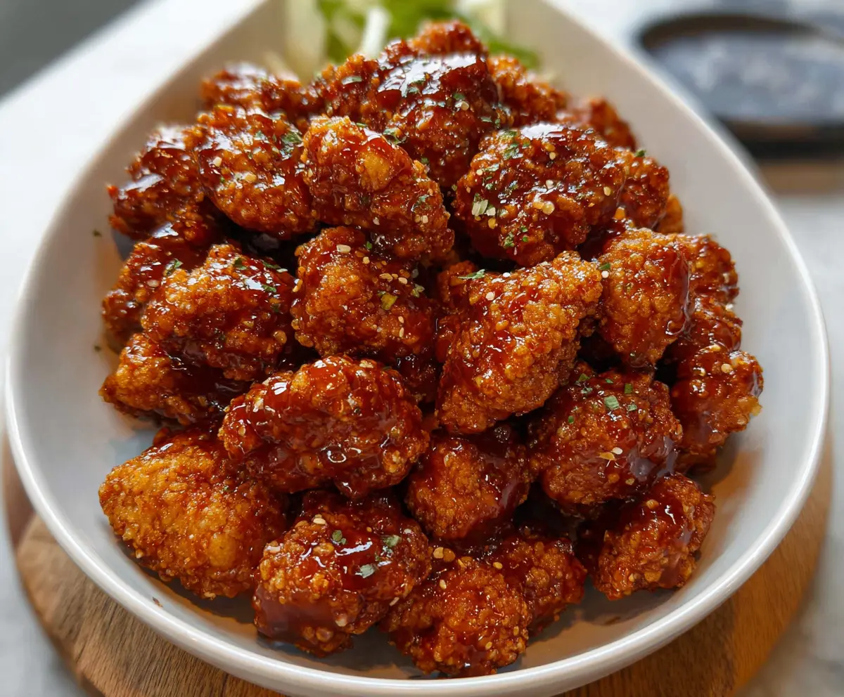 Transfer the honey BBQ popcorn chicken to a serving platter. Garnish with freshly chopped parsley for a pop of color. Serve immediately with ranch or blue cheese dressing alongside celery sticks, if you’d like. Enjoy your crispy, sweet, smoky feast!