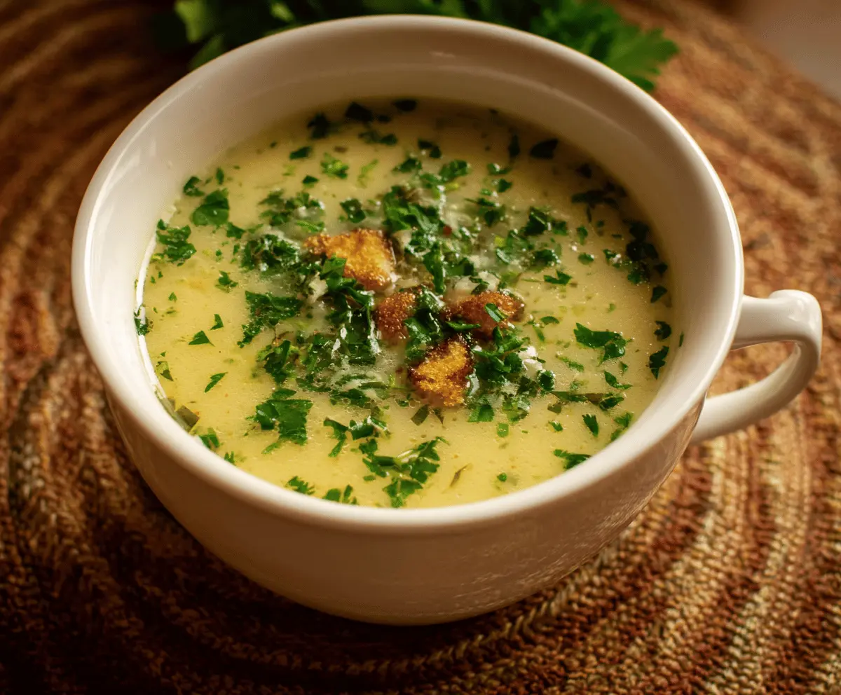Creamy Italian Garlic Soup garnished with fresh herbs and toasted bread croutons, served in a rustic bowl