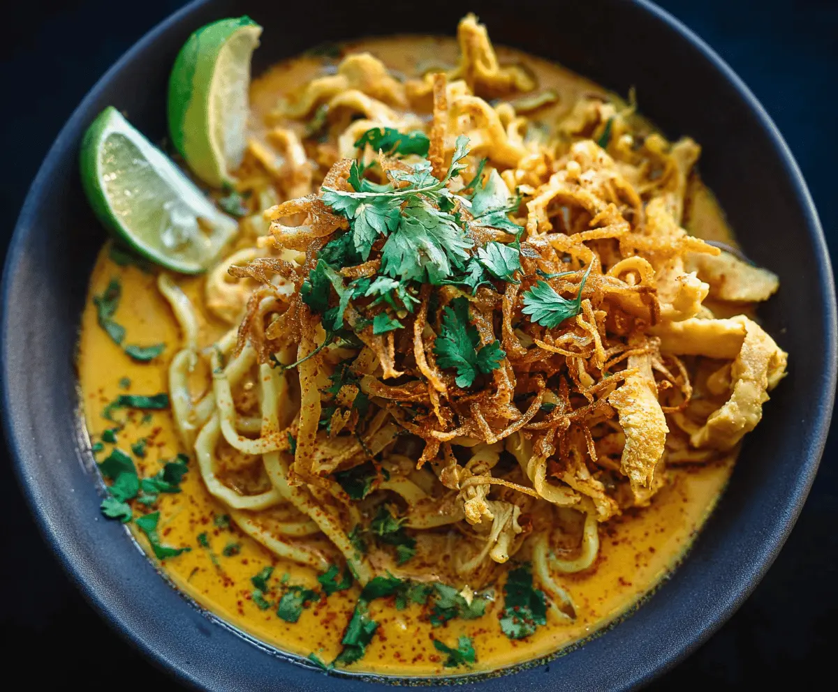 Khao Soi is a warm and creamy noodle soup that hails from Thailand. It features soft egg noodles and a rich coconut curry broth, topped with crispy noodles for that perfect crunch!