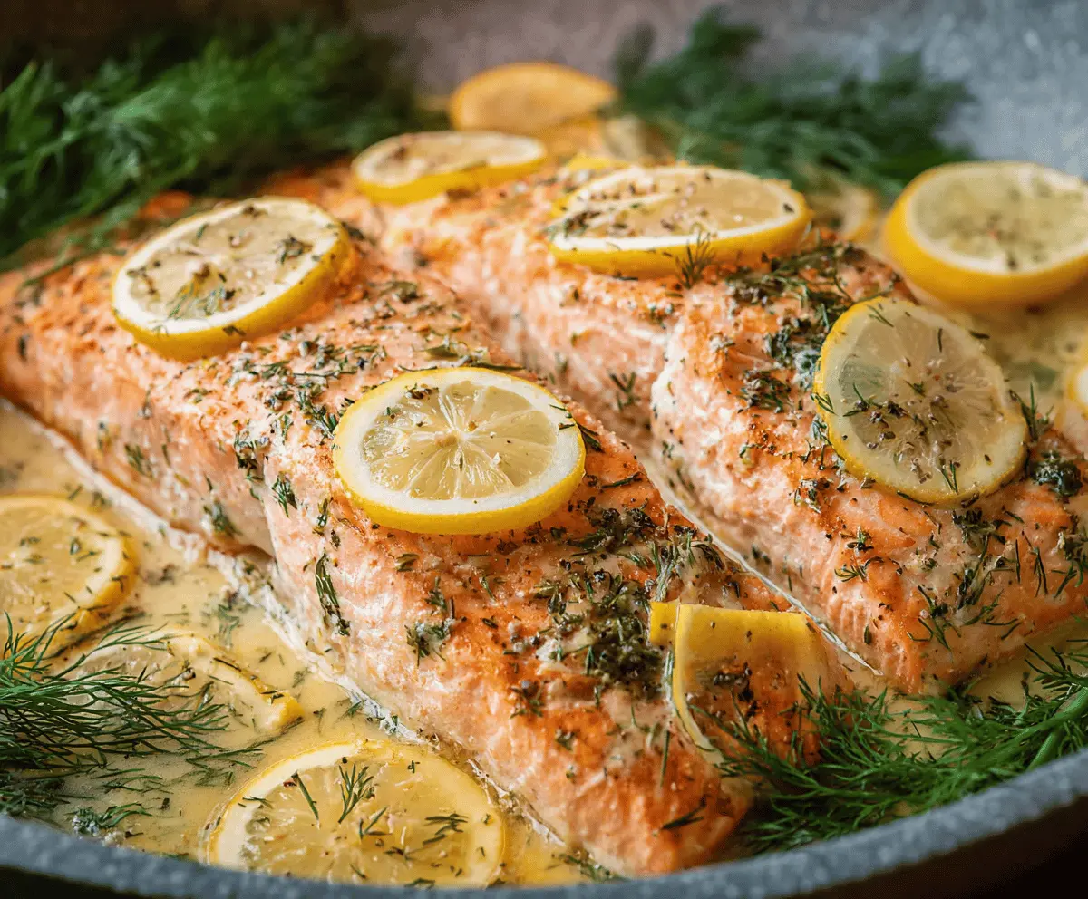 Once done, remove the skillet from the heat. Place a thin slice of lemon on top of each salmon fillet and garnish with sprigs of fresh dill for a lovely presentation.