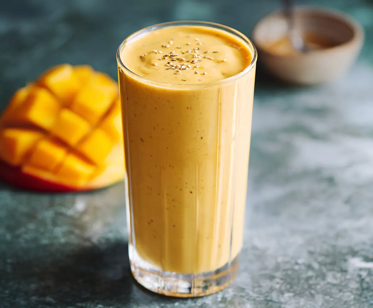 Pour your yummy smoothie into a glass. If you want, you can sprinkle some chia seeds or flaxseeds on top for garnish. Enjoy your nutritious Mango Protein Smoothie immediately!