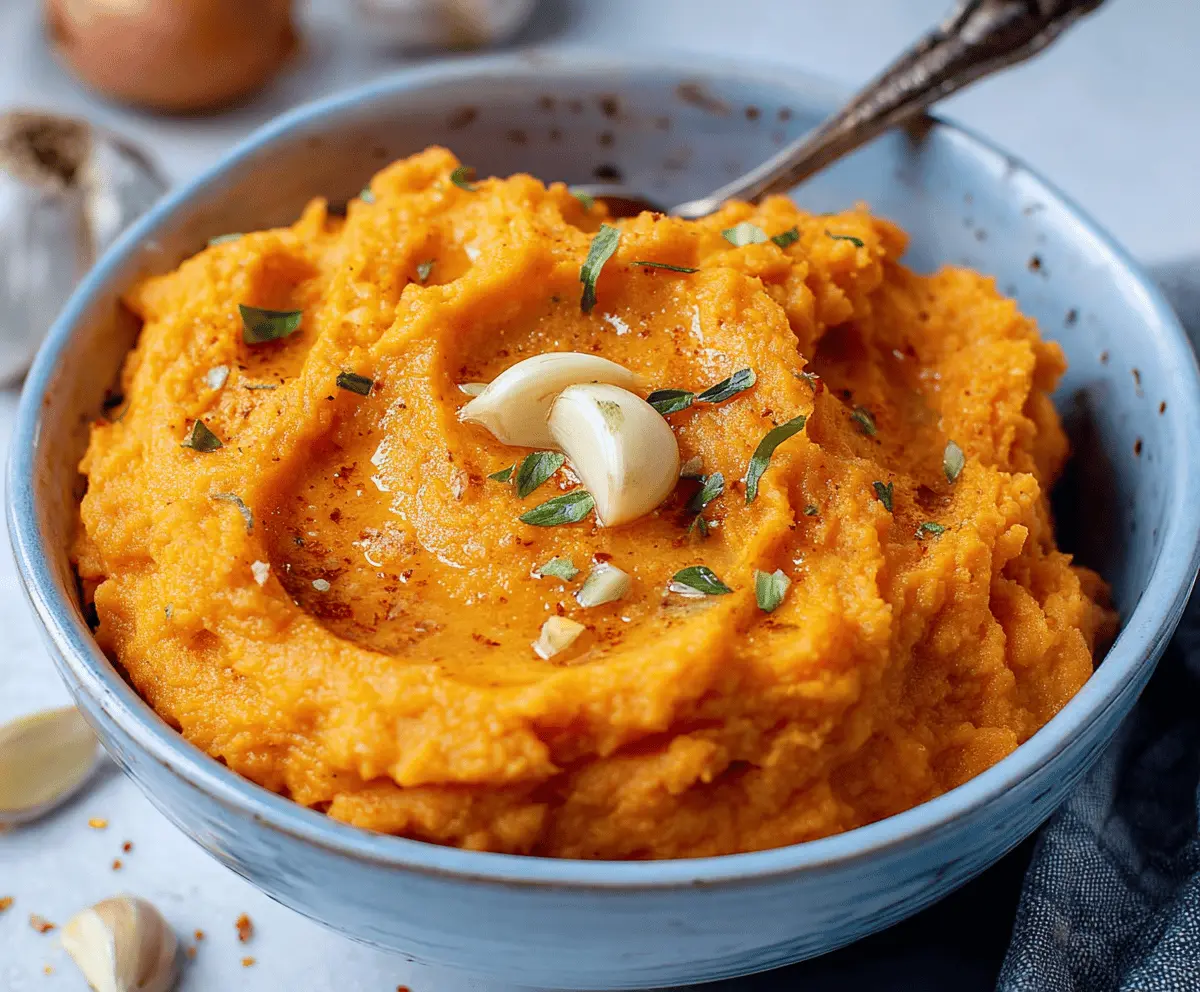Creamy mashed sweet potatoes with garlic for a flavorful side dish.