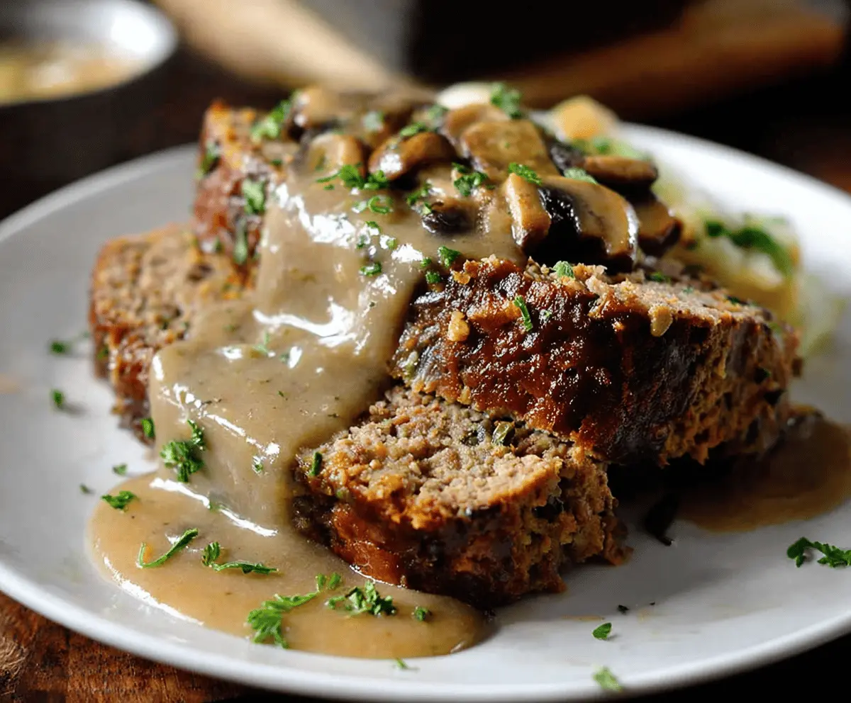 Slice your meatloaf and plate it up. Generously spoon mushroom gravy over the slices, and for a pretty touch, garnish with fresh parsley. Serve warm, and enjoy your hearty, comforting meal! It’s perfect with mashed potatoes or any of your favorite sides.