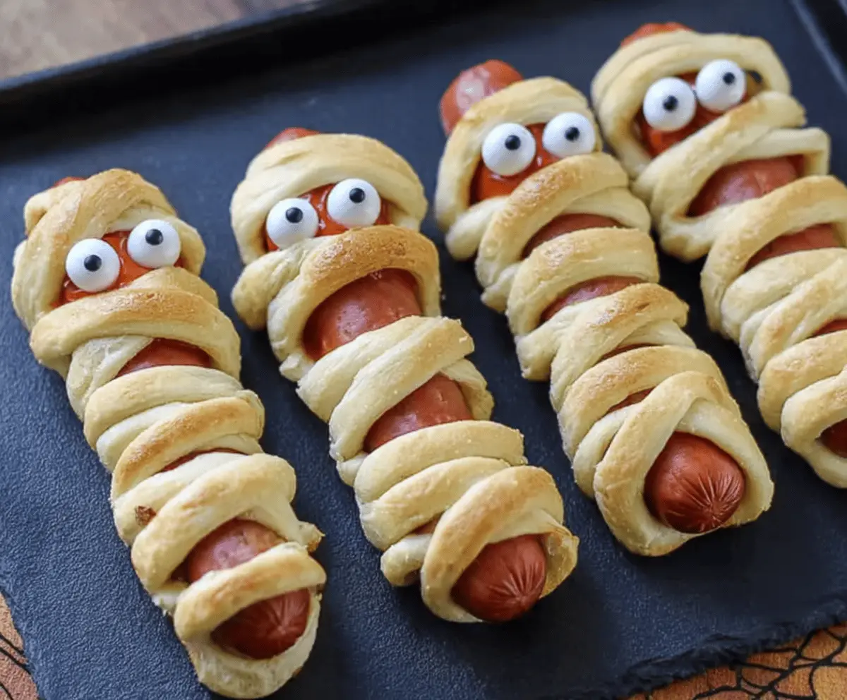 Mummy Hot Dogs are a fun and spooky treat! They’re made by wrapping hot dogs in crescent roll dough to look like little mummies, then baking them until golden brown.