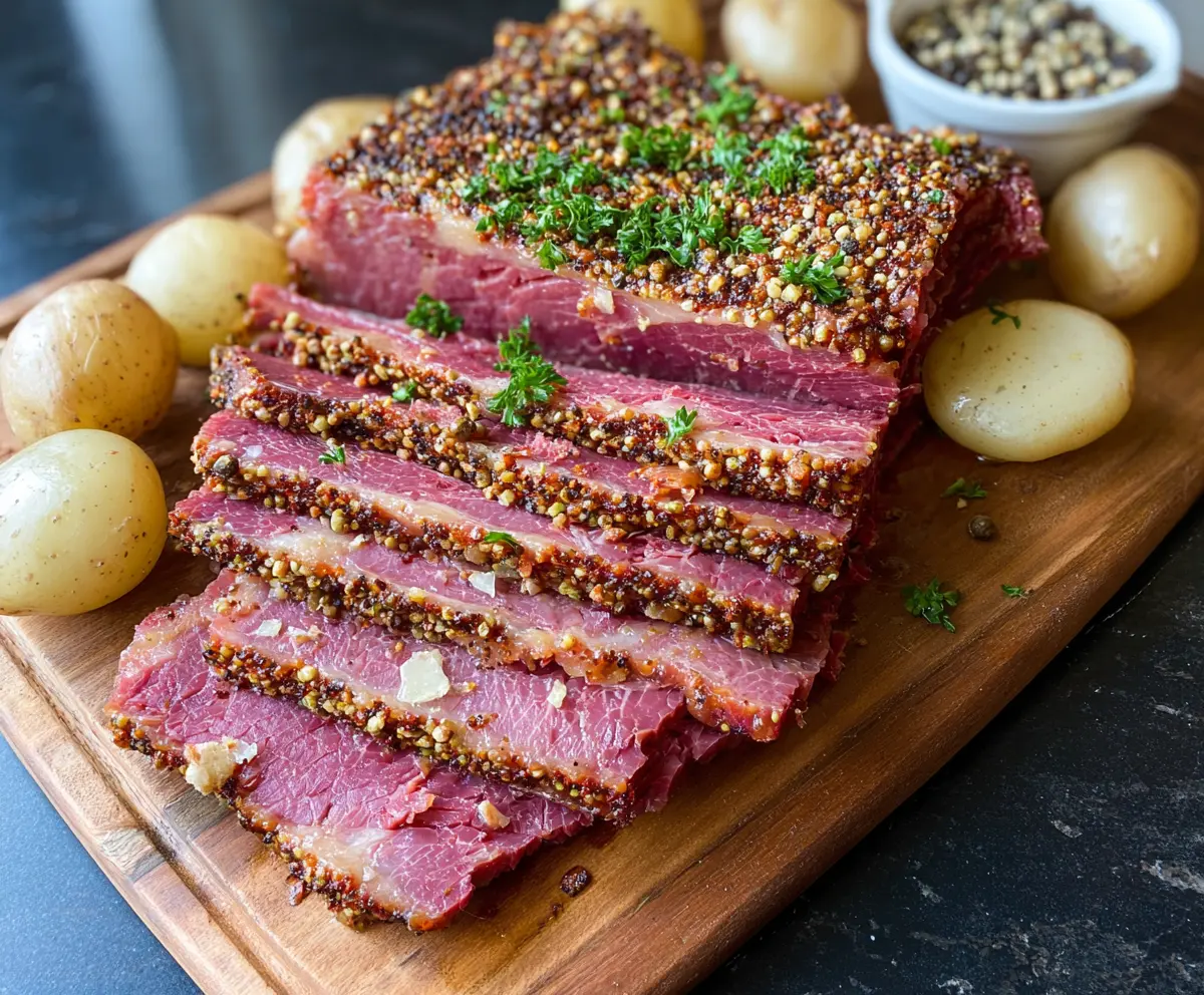 Once the corned beef is done, remove it from the oven and let it rest for 10-15 minutes. This waiting time is key to keeping the meat juicy when you slice it. After resting, slice it thinly against the grain for the best texture.