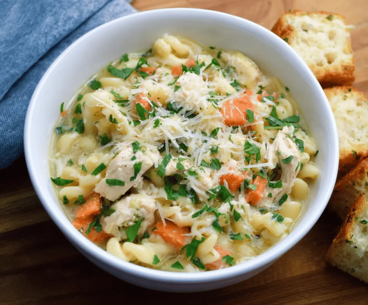 This chicken noodle soup is cozy and packed with flavor! It features tender chicken, soft noodles, and a sprinkle of parmesan to make it extra special.