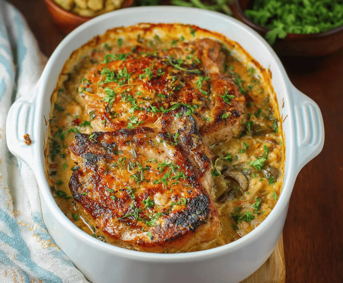 Once your casserole is done baking, remove it from the oven and let it cool slightly. Garnish with freshly chopped parsley before serving to add a pop of color! Enjoy your hearty and flavorful Pork Chop Casserole!