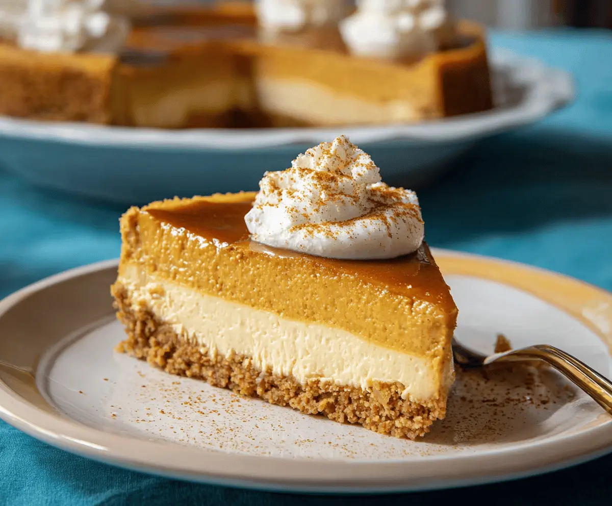 Creamy pumpkin pie cheesecake topped with whipped cream and cinnamon on a decorative plate, perfect for fall desserts.