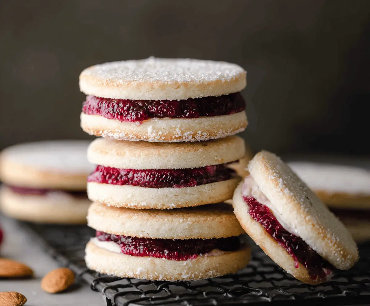 If you like, you can press a few sliced almonds into the jam of each sandwich for a lovely garnish! Serve these cookies right away or store them in an airtight container at room temperature for up to 3 days.