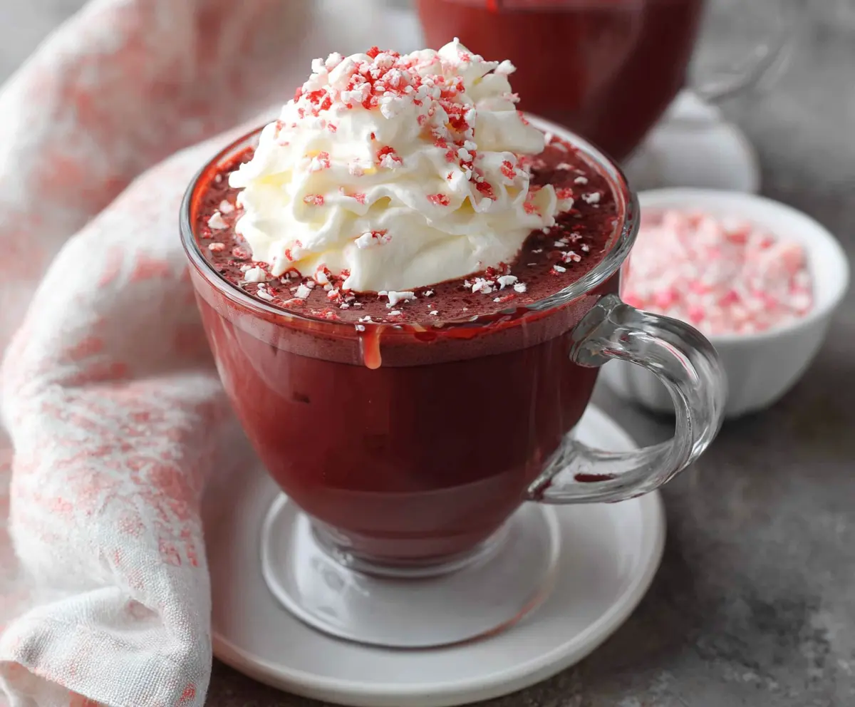 Top each mug with a big dollop of whipped cream. Then, sprinkle some crushed red velvet cake crumbs or crushed red candy on top for a festive touch!