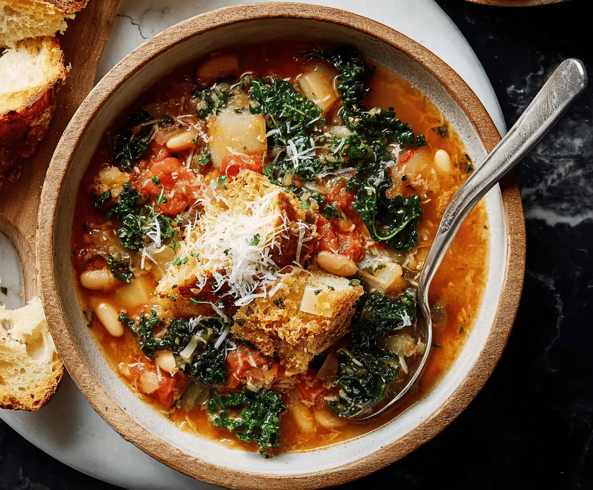 Hearty bowl of traditional Italian Ribollita soup with vegetables, beans, and crusty bread garnished with fresh herbs.