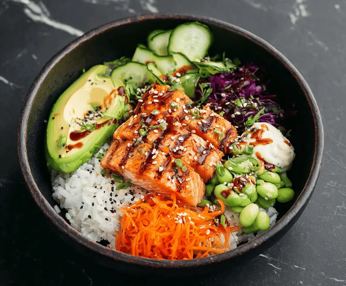 This recipe will take about 30 minutes in total. You’ll spend around 10 minutes preparing the ingredients and cooking the rice and salmon, and about 5 minutes assembling the bowls. Perfect for a quick yet satisfying meal!