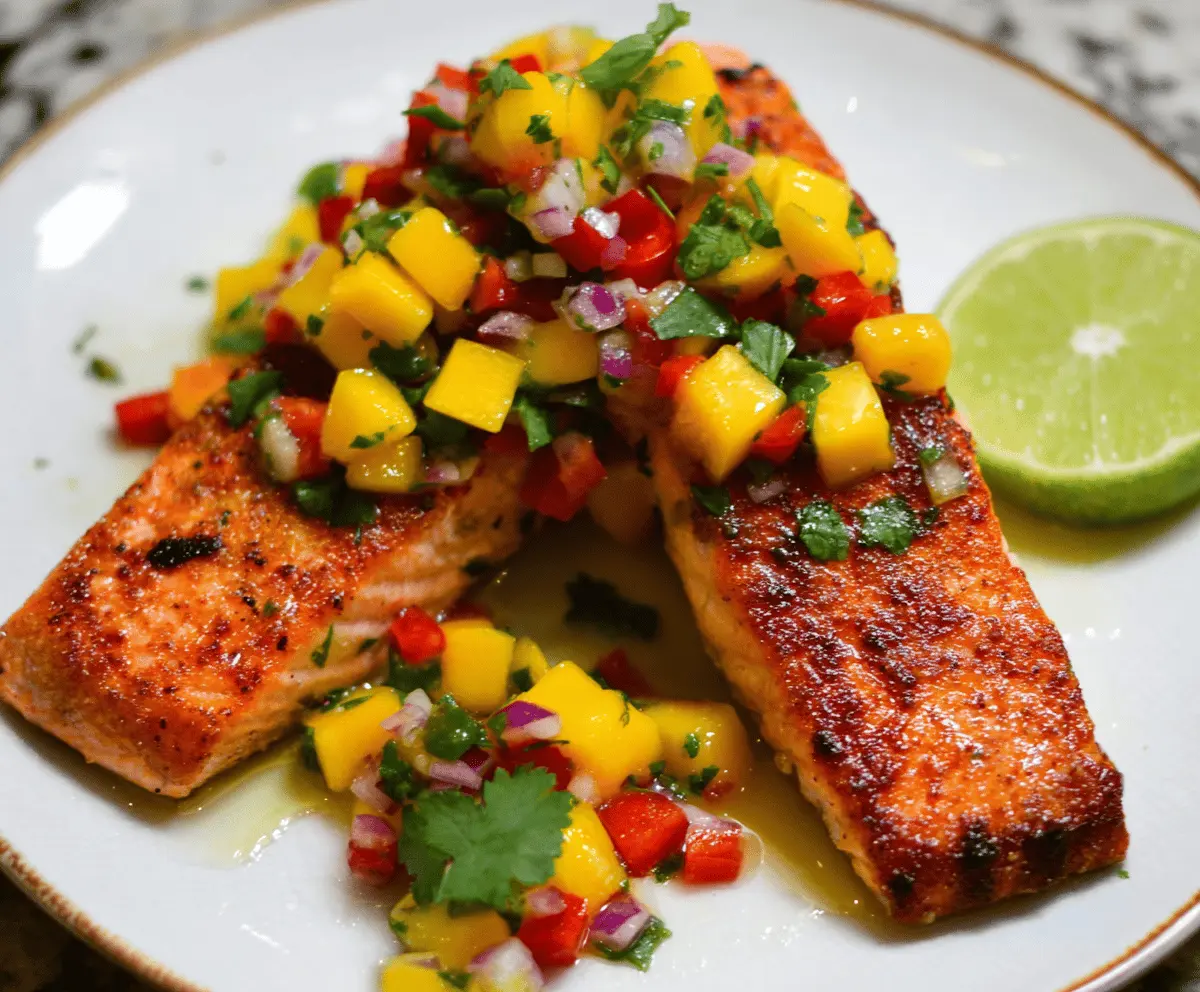Delicious grilled salmon topped with vibrant fresh mango salsa, served on a white plate with lime wedges and herbs, perfect for a healthy seafood meal.