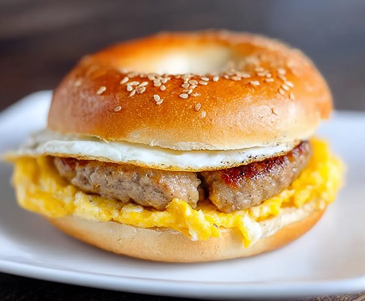 Now you have a classic breakfast sandwich that combines a perfectly toasted everything bagel, savory sausage, and a fluffy egg with a delightful runny yolk.